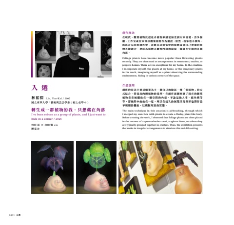 102 | 入選林祐愷國立東華大學 / 藝術與設計學系 ( 碩士在學中 )轉生成一群植物的我,只想藏在角落I've been reborn as a group of plants, and I just want to hide in a corner / 2025200 長 × 300 寬 cm壓克力Lin, You-Kai / 2002創作理念在現代,觀葉植物比起花卉植物來講更加受到大家喜愛,許多餐廳、工作室或住家常以觀葉植物作為擺設。當然,我家也不例外,所以在這次的創作中,我將自身與家中的植物或者自己想像的植物去做融合,想成為植物去觀察四周的環境,躲藏在空間的各個角落。Foliage plants have become more popular than flowering plants recently. They are often used as arrangements in restaurants, studios, or people's homes. There are no exceptions for my home. In the creation, I incorporate myself, the plants at my home, or the imaginary plants in the work, imagining myself as a plant observing the surrounding environment, hiding in various corners of the space.作品說明創作的技法主要以噴筆為主,將自己的臉以一種「很植物」的方式結合,營造出肉體植物的造型。在創作前觀察到了現在的觀葉植物常常被擺放在一個空間的角落,不論是仙人掌、鹿角蕨等等,都被集中的放在一起,所以在這次的展覽呈現效果也將作品不規則的擺放,以模擬現實的狀態。The main technique in this creation is airbrushing, through which I merged my own face with plants to create a fleshy, plant-like body. Before creating the work, I observed that foliage plants are often placed in the corners of a space-whether cacti, staghorn ferns, or others-they are typically grouped together in clusters. Thus, the exhibition presents the works in irregular arrangements to simulate this real-life setting.入 選