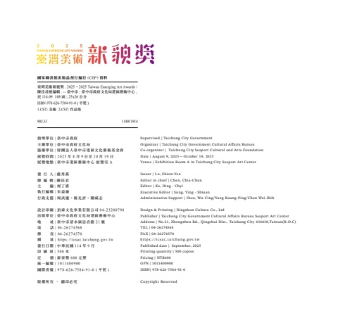 指導單位 | 臺中市政府主辦單位 | 臺中市政府文化局協辦單位 | 財團法人臺中市港區文化藝術基金會展覽時間 | 2025 年 8 月 9 日至 10 月 19 日屐覽地點 | 臺中市港區藝術中心 展覽室 A發 行 人 | 盧秀燕總 編 輯 | 陳佳君主 編 | 柯丁祺執行編輯 | 宋盈璇行政支援 | 周武慶、楊光評、陳威志設計印刷 | 頂舜文化事業有限公司 04-23280798出版單位 | 臺中市政府文化局港區藝術中心地 址 | 臺中市清水區忠貞路 21 號電 話 | 04-26274568傳 真 | 04-26274570網 址 | https://tcsac.taichung.gov.tw發行日期 | 中華民國 114 年 9 月印 刷 量 | 500 本定 價 | 新臺幣 600 元整統一編號 | 1011400900國際書號 | 978-626-7584-91-0 ( 平裝 )版權所有 • 翻印必究Supervised | Taichung City GovernmentOrganizer | Taichung City Government Cultural Affairs BureauCo-organizer | Taichung City Seaport Cultural and Arts FoundationDate | August 9, 2025 ~ October 19, 2025Venue | Exhibition Room A in Taichung City Seaport Art CenterIssuer | Lu, Shiow-YenEditor in chief | Chen, Chia-ChunEditor | Ke, Ding - ChyiExecutive Editor | Sung, Ying - ShiuanAdministrative Support | Jhou, Wu-Cing/Yang Kuang-Ping/Chen Wei-JhihDesign & Printing | Dingshun Culture Co., LtdPublisher | Taichung City Government Cultural Affairs Bureau Seaport Art CenterAddress | No.21, Zhongzhen Rd., Qingshui Dist., Taichung City 436038,Taiwan(R.O.C) TEL | 04-26274568FAX | 04-26274570https://tcsac.taichung.gov.twPublished date | September, 2025Printing quantity | 500 copiesPricing | NT$600GPN | 1011400900ISBN| 978-626-7584-91-0Copyright Reserved國家圖書館出版品預行編目 (CIP) 資料臺灣美術新貌獎 . 2025 = 2025 Taiwan Emerging Art Awards /陳佳君總編輯 . -- 臺中市 : 臺中市政府文化局港區藝術中心 , 民114.09 108 面 ; 25x26 公分ISBN 978-626-7584-91-0 ( 平裝 )1.CST: 美術 2.CST: 作品集902.33114011914