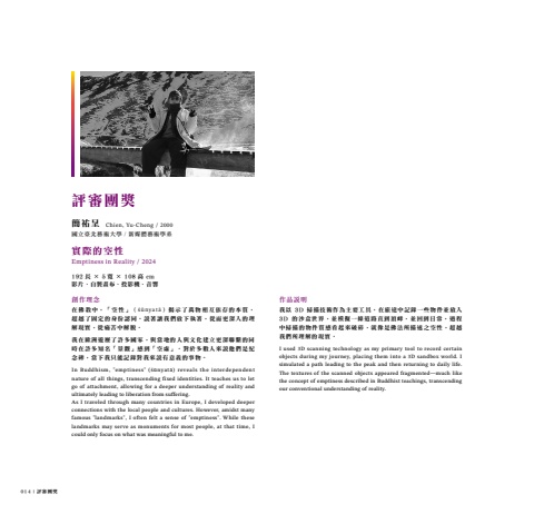 014 | 評審團獎簡祐呈國立臺北藝術大學 / 新媒體藝術學系實際的空性Emptiness in Reality / 2024192 長 × 5 寬 × 108 高 cm影片、自製畫布、投影機、音響創作理念在佛教中,「空性」(śūnyatā)揭示了萬物相互依存的本質,超越了固定的身份認同。說著讓我們放下執著,從而更深入的理解現實,從痛苦中解脫。我在歐洲遊歷了許多國家,與當地的人與文化建立更深聯繫的同時在許多知名「景觀」感到「空虛」。對於多數人來說他們是紀念碑,當下我只能記錄對我來說有意義的事物。In Buddhism, \nature of all things, transcending fixed identities. It teaches us to let go of attachment, allowing for a deeper understanding of reality and ultimately leading to liberation from suffering.As I traveled through many countries in Europe, I developed deeper connections with the local people and cultures. However, amidst many famous \landmarks may serve as monuments for most people, at that time, I could only focus on what was meaningful to me.Chien, Yu-Cheng / 2000作品說明我以 3D 掃描技術作為主要工具,在旅途中記錄一些物件並放入 3D 的沙盒世界,並模擬一條道路直到頂峰,並回到日常,過程中掃描的物件質感看起來破碎,就像是佛法所描述之空性,超越我們所理解的現實。I used 3D scanning technology as my primary tool to record certain objects during my journey, placing them into a 3D sandbox world. I simulated a path leading to the peak and then returning to daily life. The textures of the scanned objects appeared fragmented—much like the concept of emptiness described in Buddhist teachings, transcending our conventional understanding of reality.評審團獎