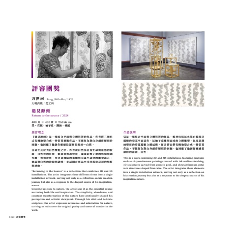 016 | 評審團獎方世河大明高職 / 美工科遇見源頭Return to the source / 2024400 長 × 400 寬 × 250 高 cm墨、宣紙、柚子皮、鐵絲、棉紙創作理念《遇見源頭》是一組結合平面與立體裝置的作品。作者將三種形式有機地整合成一件裝置藝術作品,不僅作為對自身創作歷程的回顧,也回應了他創作靈感最深層的源頭—自然。自幼生長於大自然懷抱之中,作者視自然為滋養生命與靈感的根源。自然界的質樸、繁盛與無盡變化,深深影響了他的感知與創作觀。透過此作,作者以細膩的筆觸與充滿生命感的雕塑語言,傾訴對自然的敬仰與讚嘆,並試圖在作品中尋回那份最初的純粹與感動。\eturning to the Source\installations. The artist integrates three different forms into a single installation artwork, serving not only as a reflection on his creation journey but also as a response to the deepest source of his inspirationnature.Growing up close to nature, the artist sees it as the essential source nurturing both life and inspiration. The simplicity, abundance, and constant transformation of the nature have profoundly shaped his perception and artistic viewpoint. Through his vital and delicate sculpture, the artist expresses reverence and admiration for nature, striving to rediscover the original purity and sense of wonder in the work.Fang, Shih-Ho / 1970作品說明這是一組結合平面與立體裝置的作品,媒材包括以水墨白描技法描繪的菊花平面畫作、以柚子皮雕刻而成的立體雕塑,以及以鐵絲塑形的菊花瓣脈立體結構。作者將它們有機地整合成一件裝置作品,不僅作為對自身創作歷程的回顧,也回應了他創作靈感最深層的源頭—自然。 This is a work combining 2D and 3D installations, featuring mediums such as chrysanthemum paintings created with ink outline sketching, 3D sculptures carved from pomelo peel, and chrysanthemum petal vein structures shaped from wire. The artist integrates these elements into a single installation artwork, serving not only as a reflection on his creation journey but also as a response to the deepest source of his inspiration-nature.評審團獎
