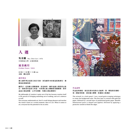 022 | 入選吳金蘭中州科技大學 / 企業管理系流金歲月Golden Years / 202450 長 × 50 寬 × 3 高 cm木板、蝶古巴特創作理念個人創作理念是很天馬行空的,因為創作本身就是從無到有,藝術也是很抽象的。雖然不一定每個人都懂藝術,但是如果一個作品讓人覺得賞心悅目,對欣賞作品的人來說,可得到心靈上觸動的某個瞬間,對作品而言就是藝術。心中有藝術,每個人都是藝術家。My philosophy of creation is quite out of the box because creation itself is the process of bringing something out of nothing, and art is abstract as well.Not everyone understands art, but if a work brings pleasure and touches the viewer’s heart at a certain moment, then it is art. When it comes to art, everyone has the potential to be an artist.Wu, Chin-Lan / 1976作品說明作品是時鐘板,底色以刮木紋的方式處理,第一層貼燙金綿紙,第二層貼專業紙。刮金屬立體劑,收邊後上保護漆。The artwork is a clock panel. I use a wood-grain scraping technique to create the background color. The first layer is covered with gold foil paper, followed by a second layer of professional-grade paper. Metallic dimensional paste is shaped and applied, followed by applying a protective varnish to finish the edges.入 選