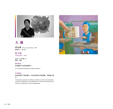 024 | 入選許正成霧峰農工 / 電工科打工仔Odd jobber / 202594 長 × 96 寬 cm油彩、木板創作理念以詼諧的方式表現基層勞工。It is a humorous depiction of ordinary laborers.作品說明表達基層勞工如同機具,在流水線作業不斷運轉,求溫飽又無奈。A humorous portrayal of ordinary workers as if they were machinesconstantly working on the assembly line, tirelessly striving for basic survival, yet filled with a sense of helplessness.Shiu, Jeng-Cheng / 1980入 選