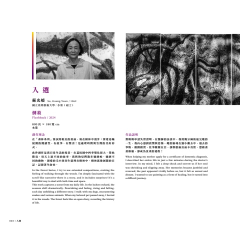 026 | 入選蘇光媛國立臺灣藝術大學 / 水墨(碩士)倒敘Flashback / 2024800 長 × 180 寬 cm水墨創作理念在「森林系列」嘗試用較長的畫面,如在樹林中漫步;深愛卷軸展開的閱讀性,有故事、有驚喜!是處理時間與空間的美好形式。此件創作是我日常生活的場景,在荔枝園中四季變化很大,榮枯勝衰,每天上演不同的故事,我與狗兒們散步遇到蛇、遇到不同的動物、親愛的毛小孩往生就埋在樹林中,樹林就像展開的日記,記錄著生命史。In the Forest Series, I try to use extended compositions, evoking the feeling of walking through the woods. I'm deeply fascinated with the scroll-like narrative-there is a story, and it includes surprises! It’s a beautiful way to deal with both time and space.This work captures a scene from my daily life. In the lychee orchard, the seasons shift dramatically- flourishing and fading, rising and fallingeach day unfolding a different story. I walk with my dogs, encountering snakes and various animals. When my beloved pet passed away, I buried it in the woods. The forest feels like an open diary, recording the history of life.Su, Guang-Yuan / 1962作品說明幫媽媽申請失智證明,在醫師的訪談中,我用幾分鐘敘述完她的一生,我內心感到震驚與悲傷,她的靈魂在縮小離去中,過去的事物,顛倒錯置,往事歷歷在目,卻那麼虛幻而不真實。想藉畫畫療癒,卻成為沈重的過程!When helping my mother apply for a certificate of dementia diagnosis, I described her entire life in just a few minutes during the doctor’s interview. In my mind, I felt a deep shock and sorrow-as if her soul was shrinking and slipping away. Her memories became jumbled and reversed; the past appeared vividly before us, but it felt so unreal and distant. I wanted to use painting as a form of healing, but it turned into a difficult journey.入 選
