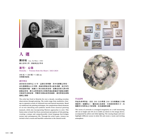 028 | 入選劉育妏國立清華大學 / 藝術與設計學系新竹∙心築Hsinchu . Visions from the Heart / 2023-2024200 長 × 250 寬 × 5 高 cm水墨紙本設色創作理念畫者居住在新竹已 10 年,記錄日常所觀,其中有靜觀之特寫,亦有叢樹層山之大空間;畫面以傳統水墨元素為基礎,結合寫生與畫譜的符號,並融合了西方的色彩表現,意圖走出眾人對水墨的既定印象,將大自然與當代日常物件藉由藝術思考創造出獨特且貼近生活的意象,望觀者可藉由畫者的凝視,感受對造化萬物溫暖之情懷。The artist has lived in Hsinchu for over a decade, recording everyday observations through painting. The works range from meditative closeups to expansive scenes of clustered trees and layered mountains. Based on traditional ink painting techniques, the compositions blend elements of on-site sketching and symbolic motifs from classical painting manuals, while also incorporating Western approaches to color. This fusion aims to break free from conventional perceptions of ink painting, creating a unique and comprehensible visual language that bridges nature and contemporary life. Through the artist’s gaze, viewers are invited to feel a warm and heartfelt connection to the natural world.Liu, Yu-Wen / 1993作品說明作品為系列作品,在長 200 公分與寬 250 公分的牆面上不規則排列 ( 如圖所示 ),輔以黃白光投射,不同的形狀與尺寸,凸顯觀者日常所見之不同景物,以及溫暖的氛圍。The series of artworks is arranged irregularly on a wall measuring 200 cm in height and 250 cm in width (as shown in the image above), accompanied by yellow and white lighting. The varying shapes and sizes highlight different scenes in daily life and create a warm and inviting atmosphere.入 選