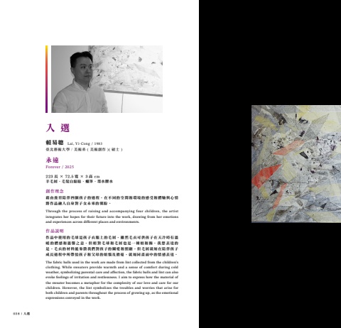 038 | 入選賴易聰臺北藝術大學 / 美術系 ( 美術創作 )( 碩士 )永遠Forever / 2025223 長 × 72.5 寬 × 3 高 cm羊毛屑、毛髮自黏貼、蠟筆、墨水膠水創作理念藉由養育陪伴四個孩子的過程,在不同的空間和環境的感受和體驗與心情將作品融入自身對子女未來的翼盼。Through the process of raising and accompanying four children, the artist integrates her hopes for their future into the work, drawing from her emotions and experiences across different places and environments.作品說明作品中使用的毛球是孩子衣服上的毛屑,雖然毛衣可供孩子在天冷時有溫暖的體感和溫馨之意,但相對毛球和毛屑也是一種煩和躁。我想表達的是,毛衣的材料能象徵我們對孩子的關愛和照顧,但毛屑就如在陪伴孩子成長過程中所帶給孩子和父母的煩惱及擔憂,就如同畫面中的情感表達。 The fabric balls used in the work are made from lint collected from the children’s clothing. While sweaters provide warmth and a sense of comfort during cold weather, symbolizing parental care and affection, the fabric balls and lint can also evoke feelings of irritation and restlessness. I aim to express how the material of the sweater becomes a metaphor for the complexity of our love and care for our children. However, the lint symbolizes the troubles and worries that arise for both children and parents throughout the process of growing up, as the emotional expressions conveyed in the work.Lai, Yi-Cong / 1983入 選