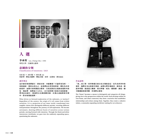 042 | 入選李承哲華梵大學 / 美術與文創系意圖的分類Classification of Intentions / 2025320 長 × 460 寬 × 300 高 cm代針筆、壓克力顏料、壓克力板、木作、石膏布、黑火山石創作理念是什麼引領我們前行,探索未知、本能驅使?不論答案為何,一切的源頭,都來自於自己,是我們內在世界的投射,轉化為有形的視界,而將不同時期區分開來,呈現出對於自我探索過程中的每一種詮釋。我們成了太空人,在不同時期下展現不同的樣貌,帶著意念前行,透過黑白交錯的觀景窗,在無止盡延伸的空間中,對未知發起追問。What drives us forward-exploration of the unknown, or instinct? Regardless of the answer, the origin of it all comes from within ourselves. It is a projection of our inner world, transformed into tangible visions that distinguish different periods, revealing different interpretations throughout the journey of self-exploration. We become astronauts, showing different facets of ourselves across various periods, moving forward with intention. Through the black-and-white interwoven viewfinder, we gaze into the endlessly expanding space, questioning the unknown.Lee, Cheng-Che / 1995作品說明「框」成了對一切事物進行區分及分類的設定,衍生出世界中的視界,他們在各自的框中發展,而將它們串連起來,便形成一種故事型態,彼此建立關係、相互呼應,成為一個整體,創造一個不斷擴展的視界觀,待我們去發現。 The \giving rise to the perspectives within the world. Each develops within its own frame, and when connected, they form a narrative that establishes relationships and echoes among them. Together, they create a cohesive whole, a constantly expanding worldview waiting for us to discover.入 選