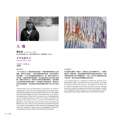 044 | 入選劉品汝國立臺南藝術大學 / 應用藝術研究所 ( 纖維藝術 )( 碩士 )不平凡的日子Unusual Days / 2025130 長 × 25 寬 cm日曆紙創作理念《不平凡的日子》透過祖母的沙龍照、母親的婚紗照與我自己的獨照,轉印在日曆紙上,再將其層層拆解與重組。影像在拆解中變得模糊,三代女性的臉龐彷彿被融合為一體,難以分辨卻又各自清晰。日曆象徵著時間的推移,也記錄著跨世代女性的生命經驗。我們在相同年紀,承擔著不同時代的選擇與壓力,而我選擇走出母親與祖母的既定軌跡。這些模糊又重疊的影像,映照出家族記憶的連續性,也彰顯我在傳統與個體意識中尋求定位的過程。\nusual Days\wedding photo, and my solo shot, transferring them onto calendar paper, then deconstructing and reconstructing them layer by layer. The images become blurred through the process of deconstruction, as the faces of three generations of women seem to merge into one, indistinguishable, yet each remaining distinctly visible. The calendar symbolizes the passage of time and also serves as a record of the women life across generations. At the same age, we each bear the choices and pressures of different eras, but I choose to step away from the predetermined paths of my mother and grandmother. These blurred and overlapping images reflect the continuity of family memory and highlight my journey of seeking identity between tradition and individual consciousness.Liu, Pin-Ju / 2000作品說明以日曆紙為載體,將祖母、母親與自己的肖像轉印其上,再將影像剪裁、層層重組。紙張的脆弱與時間性對應記憶的易逝,影像在轉印與拼貼中產生模糊與融合,呈現三代女性之間既重疊又獨立的身影,探討家庭記憶與個體身份的交織。 I use calendar paper as a medium to transfer the portraits of my grandmother, mother, and myself onto it and cut and layer the images to reconstruct them piece by piece. The fragility of the paper and the symbol of passage of time reflect the fade of memory. Through transfer and collage, the images become blurred and merged, revealing the overlapping yet distinct presence of three generations of women, exploring the intertwining of family memory and individual identity.入 選