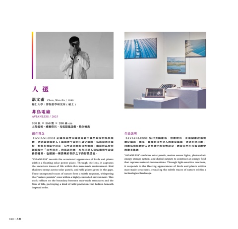 048 | 入選湛文甫輔仁大學 / 博物館學研究所 ( 碩士 )非鳥電廠AVIANLESS / 2025300 長 × 350 寬 × 200 高 cm太陽能板、感應燈具、光電儲能設備、數位輸出創作理念《AVIANLESS》記錄水面型太陽能電廠中偶然現身的鳥與植物,透過鏡頭捕捉人工場域裡生命的不確定軌跡。鳥影掠過光電板、野植在縫隙中滋長,這些非預期的自然痕跡,構成對高度控制環境中「自然仍在」的低語回應。本作反思人造結構與生命流動的邊界,也描繪一種潛藏於秩序之下的野性詩意。\ records the occasional appearance of birds and plants within a floating solar power plant. Through the lens, it captures the uncertain traces of life within this man-made environment. Bird shadows sweep across solar panels, and wild plants grow in the gaps. These unexpected traces of nature form a subtle response, whispering that “nature persists” even within a highly controlled environment. This work reflects on the boundary between man-made structures and the flow of life, portraying a kind of wild poeticism that hidden beneath imposed order.Chen, Wen-Fu / 1989作品說明《AVIANLESS》結合太陽能板、感應燈具、光電儲能設備與數位輸出,構築一個捕捉自然介入的能量場域。透過光感反應,回應鳥與植物於人造結構中的短暫現身,映現自然在技術景觀中的微光軌跡。 \ combines solar panels, motion sensor lights, photovoltaic energy storage system, and digital outputs to construct an energy field that captures nature’s interventions. Through light-sensitive reactions, it responds to the fleeting appearances of birds and plants within man-made structures, revealing the subtle traces of nature within a technological landscape.入 選