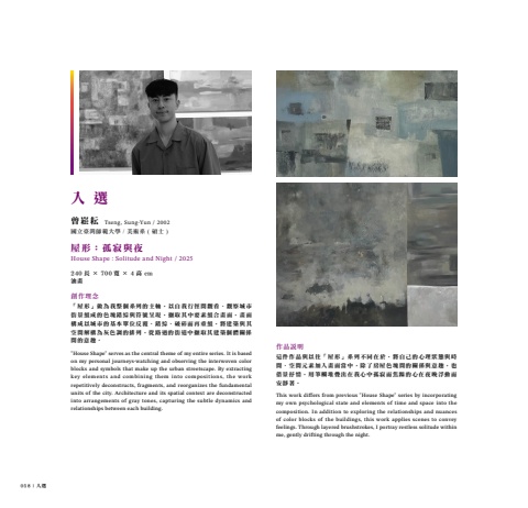 058 | 入選曾崧耘國立臺灣師範大學 / 美術系 ( 碩士 )屋形:孤寂與夜House Shape : Solitude and Night / 2025240 長 × 700 寬 × 4 高 cm油畫創作理念「屋形」做為我整個系列的主軸,以自我行徑間觀看、觀察城市街景組成的色塊錯綜與符號呈現,擷取其中要素組合畫面,畫面構成以城市的基本單位反覆、錯綜、破碎而再重組,將建築與其空間解構為灰色調的排列,從路過的街道中擷取其建築個體關係間的意趣。\ouse Shape\on my personal journeys-watching and observing the interwoven color blocks and symbols that make up the urban streetscape. By extracting key elements and combining them into compositions, the work repetitively deconstructs, fragments, and reorganizes the fundamental units of the city. Architecture and its spatial context are deconstructed into arrangements of gray tones, capturing the subtle dynamics and relationships between each building.Tseng, Sung-Yun / 2002作品說明這件作品與以往「屋形」系列不同在於,將自己的心理狀態與時間、空間元素加入畫面當中,除了房屋色塊間的關係與意趣,也借景抒情,用筆觸堆疊出在我心中孤寂而焦躁的心在夜晚浮動而安靜著。This work differs from previous \my own psychological state and elements of time and space into the composition. In addition to exploring the relationships and nuances of color blocks of the buildings, this work applies scenes to convey feelings. Through layered brushstrokes, I portray restless solitude within me, gently drifting through the night.入 選