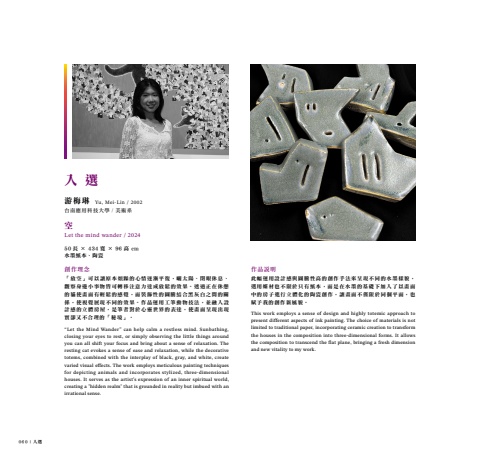 060 | 入選游梅琳台南應用科技大學 / 美術系空Let the mind wander / 202450 長 × 434 寬 × 96 高 cm水墨紙本、陶瓷創作理念「放空」可以讓原本煩躁的心情逐漸平復,曬太陽、閉眼休息、觀察身邊小事物皆可轉移注意力達成放鬆的效果。透過正在休憩的貓使畫面有輕鬆的感覺,而裝飾性的圖騰結合黑灰白之間的關係,使視覺展現不同的效果。作品運用工筆動物技法,並融入設計感的立體房屋,是筆者對於心靈世界的表達,使畫面呈現出現實卻又不合理的「秘境」。“Let the Mind Wander” can help calm a restless mind. Sunbathing, closing your eyes to rest, or simply observing the little things around you can all shift your focus and bring about a sense of relaxation. The resting cat evokes a sense of ease and relaxation, while the decorative totems, combined with the interplay of black, gray, and white, create varied visual effects. The work employs meticulous painting techniques for depicting animals and incorporates stylized, three-dimensional houses. It serves as the artist’s expression of an inner spiritual world, creating a \irrational sense.Yu, Mei-Lin / 2002作品說明此幅運用設計感與圖騰性高的創作手法來呈現不同的水墨樣貌,選用媒材也不限於只有紙本,而是在水墨的基礎下加入了以畫面中的房子進行立體化的陶瓷創作,讓畫面不僅限於同個平面,也賦予我的創作新風貌。This work employs a sense of design and highly totemic approach to present different aspects of ink painting. The choice of materials is not limited to traditional paper, incorporating ceramic creation to transform the houses in the composition into three-dimensional forms. It allows the composition to transcend the flat plane, bringing a fresh dimension and new vitality to my work.入 選