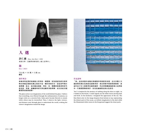 070 | 入選許仁蕙東海大學 / 美術學系研究所 ( 碩士在學中 )海Sea / 202372.5 長 × 91 寬 × 3 高 cm膠彩創作理念玻璃系列是對於玻璃後方世界的一種想像,因為我認為所有的事物在經過記憶的沉澱之後並不是一個具象的存在,而是某些地方被模糊、抹去,也可能是加強。所以,以一種觀看玻璃看時產生的光影、質感、疏離感來產生對這個世界的理解,並且以此引起觀眾對畫面的想像。The glass series is an imagination of the world behind the glass. I believe that everything, once filtered through the sedimentation of memory, no longer exists as a concrete form. Some parts become blurred or erased, while others may be intensified. Thus, I observe the light, texture, and distance seen through glass to understand the world, evoking the viewer's imagination toward the image.Hsu, Jen-Hui / 1999作品說明「海」是以回憶中夜晚在海邊散步時的情景出發,走在沙灘上只能依稀看到白色的浪花前後來回,我在黑暗中猜想海的樣貌,畫面中由下至上的藍黑色越來越深,代表著距離越遠的地方是黑暗中一片無限想像的海洋,以及近處被照亮的白色浪花。\ea” is inspired by the memory of walking along the shore at night. As I walked on the beach, I could vaguely see the white waves moving back and forth. In the darkness, I imagined the appearance of the sea. The blue-black color in the image deepens from bottom to top, representing the distant parts of the ocean, an infinite imagination in the dark while the illuminated white waves in the foreground suggest the closer parts.入 選