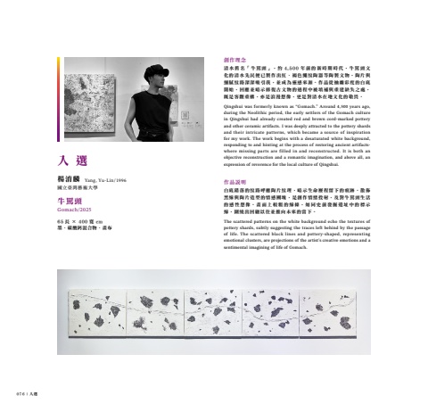 076 | 入選楊淯麟國立臺灣藝術大學牛罵頭Gomach/202565 長 × 400 寬 cm墨、碳酸鈣混合物、畫布Yang, Yu-Lin/1996創作理念清水舊名「牛罵頭」,約 4,500 年前的新時期時代,牛罵頭文化的清水先民便已製作出紅、褐色繩紋陶器等陶製文物,陶片與細膩紋路深深吸引我,並成為靈感來源。作品從抽離彩度的白底開始,回應並暗示修復古文物的過程中被填補與重建缺失之處,既是客觀重構,亦是浪漫想像,更是對清水在地文化的敬畏。Qingshui was formerly known as “Gomach.” Around 4,500 years ago, during the Neolithic period, the early settlers of the Gomach culture in Qingshui had already created red and brown cord-marked pottery and other ceramic artifacts. I was deeply attracted to the pottery shards and their intricate patterns, which became a source of inspiration for my work. The work begins with a desaturated white background, responding to and hinting at the process of restoring ancient artifactswhere missing parts are filled in and reconstructed. It is both an objective reconstruction and a romantic imagination, and above all, an expression of reverence for the local culture of Qingshui.作品說明白底錯落的紋路呼應陶片紋理,暗示生命歷程留下的痕跡。散佈黑線與陶片造型的情感團塊,是創作情緒投射,及對牛罵頭生活的感性想像。畫面上較粗的線條,如同史前發掘遺址中的標示線,圍繞出回顧以往並推向未來的當下。The scattered patterns on the white background echo the textures of pottery shards, subtly suggesting the traces left behind by the passage of life. The scattered black lines and pottery-shaped, representing emotional clusters, are projections of the artist's creative emotions and a sentimental imagining of life of Gomach.入 選