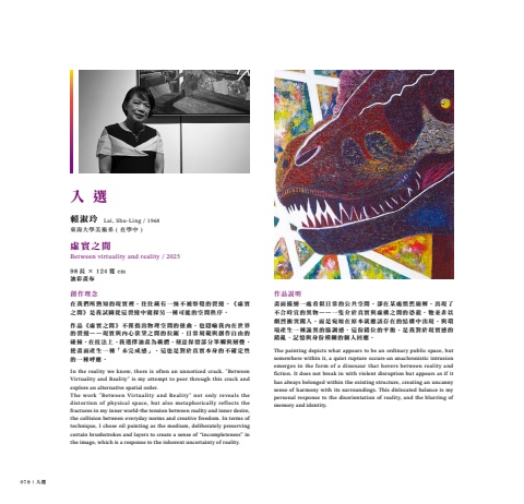 078 | 入選賴淑玲東海大學美術系 ( 在學中 )虛實之間Between virtuality and reality / 202598 長 × 124 寬 cm油彩畫布創作理念在我們所熟知的現實裡,往往藏有一絲不被察覺的裂縫。《虛實之間》是我試圖從這裂縫中窺探另一種可能的空間秩序。作品《虛實之間》不僅指出物理空間的扭曲,也隱喻我內在世界的裂縫——現實與內心欲望之間的拉鋸、日常規範與創作自由的碰撞。在技法上,我選擇油畫為載體,刻意保留部分筆觸與層疊,使畫面產生一種「未完成感」,這也是對於真實本身的不確定性的一種呼應。In the reality we know, there is often an unnoticed crack. \Virtuality and Reality\explore an alternative spatial order. The work \distortion of physical space, but also metaphorically reflects the fractures in my inner world-the tension between reality and inner desire, the collision between everyday norms and creative freedom. In terms of technique, I chose oil painting as the medium, deliberately preserving certain brushstrokes and layers to create a sense of “incompleteness” in the image, which is a response to the inherent uncertainty of reality.Lai, Shu-Ling / 1968作品說明畫面描繪一處看似日常的公共空間,卻在某處悄然崩解,出現了不合時宜的異物——一隻介於真實與虛構之間的恐龍。牠並非以劇烈衝突闖入,而是宛如在原本就應該存在的結構中出現,與環境產生一種詭異的協調感。這份錯位的平衡,是我對於現實感的錯亂、記憶與身份模糊的個人回應。The painting depicts what appears to be an ordinary public space, but somewhere within it, a quiet rupture occurs-an anachronistic intrusion emerges in the form of a dinosaur that hovers between reality and fiction. It does not break in with violent disruption but appears as if it has always belonged within the existing structure, creating an uncanny sense of harmony with its surroundings. This dislocated balance is my personal response to the disorientation of reality, and the blurring of memory and identity.入 選