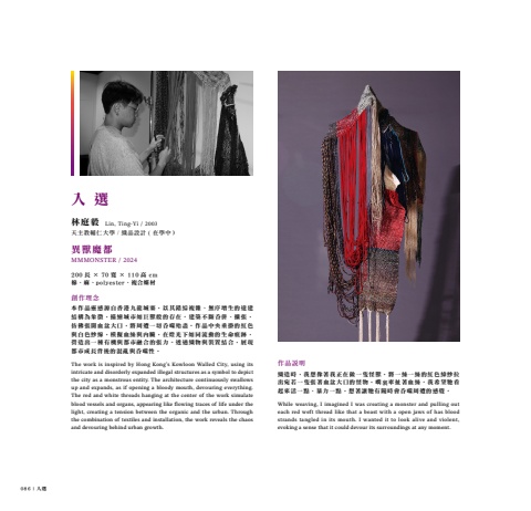 086 | 入選林庭毅天主教輔仁大學 / 織品設計 ( 在學中)異獸魔都MMMONSTER / 2024200 長 × 70 寬 × 110 高 cm棉、麻、polyester、複合媒材創作理念本作品靈感源自香港九龍城寨,以其錯綜複雜、無序增生的違建結構為象徵,描繪城市如巨獸般的存在。建築不斷吞併、擴張,仿佛張開血盆大口,將周遭一切吞噬殆盡。作品中央垂掛的紅色與白色紗線,模擬血絲與內臟,在燈光下如同流動的生命痕跡,營造出一種有機與都市融合的張力。透過織物與裝置結合,展現都市成長背後的混亂與吞噬性。The work is inspired by Hong Kong’s Kowloon Walled City, using its intricate and disorderly expanded illegal structures as a symbol to depict the city as a monstrous entity. The architecture continuously swallows up and expands, as if opening a bloody mouth, devouring everything. The red and white threads hanging at the center of the work simulate blood vessels and organs, appearing like flowing traces of life under the light, creating a tension between the organic and the urban. Through the combination of textiles and installation, the work reveals the chaos and devouring behind urban growth.Lin, Ting-Yi / 2003作品說明織造時,我想像著我正在做一隻怪獸,將一絲一絲的紅色緯紗拉出宛若一隻張著血盆大口的怪物,嘴裏牽扯著血絲。我希望牠看起來活一點、暴力一點,想著讓牠有隨時會吞噬周遭的感覺。While weaving, I imagined I was creating a monster and pulling out each red weft thread like that a beast with a open jaws of has blood strands tangled in its mouth. I wanted it to look alive and violent, evoking a sense that it could devour its surroundings at any moment.入 選