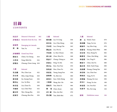 目錄CONTENTS局長序評審感言新貌獎入選入選展場吳金蘭許正成蘇光媛劉育妏林君達李錦財魏呈哲莊淑芬簡祐呈方世河莊駿良蔡 瑜Director’s ForewordRemarks from the JuryEmerging Art AwardsSelectedSelectedExhibition venueWu, Chin-LanShiu, Jeng-ChengSu, Guang-YuanLiu, Yu-WenLin, Chun-Ta Lee, Chin-ThaiWei, Cheng-ZheChuang, Shu-Fen022024026028030032034036Chien, Yu-ChengFang, Shih-HoChuang, Chun-Liang014016018Tsai, Yu010002004106賴易聰林家弘李承哲劉品汝李浩銓湛文甫張瀞予彭俞心郭芸妘徐兆甫曾崧耘游梅琳孫知行王凱鶴蔡昕珆陳 寬許仁蕙蔡式媚謝 元楊淯麟賴淑玲黃筱雯侯宏堉陳薈茗林庭毅陳思宇施岳東黃政耀林佳昀楊柏以黃德倫洪昱仁林祐愷吳裴苓Lai, Yi-CongLin, Chia-HungLee, Cheng-CheLiu, Pin-JuLi, Hao-ChuanChen, Wen-FuChang, Ching-yu Peng, Yu-SinKuo, Yun-YunHsu, Chao-FuTseng, Sung-YunYu, Mei-LinSun, Chih-HsingWang, Kai- HoTsai, Hsin-YiChen, KuanHsu, Jen-HuiTsai, Shih-MeiHsieh, YuanYang, Yu-LinLay, Shu-Ling Huang, Hsiao-WenHou, Hung-YuChen, Hui-MingLin, Ting-YiChen, Szu-Yu Shih, Yueh-TungHuang, Cheng-YaoLin, Chia-YunYang, Po-YiHuang, De-LunHung, Yu-JenLin, You-KaiWu, Pei-Ling038040042044046048050052054056058060062064066068070072074076078080082084086088090092094096098100102104評審團獎入選Grand Jury PrizeSelected目錄| 007