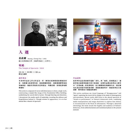 092 | 入選黃政耀國立臺灣藝術大學 / 美術學系碩士 ( 在學中 )聖殿The Temple of Spectacle / 2024381 長 × 299 寬 × 3 高 cm壓克力顏料創作理念本系列作品以七件式作品為一件,構築出如神殿般的總統府形象,象徵權力的神聖外殼。透過模糊與變形,我解構媒體塑造的領袖神話,揭露其背後的失焦與遺忘。外觀莊嚴,實則荒謬如歡樂劇場。This series is composed of seven individual pieces to form a single work, constructing a temple-like image of the Presidential Office Building, symbolizing the sacred shell of power. Through blurring and distortion, I deconstruct the media myth of leadership, revealing the defocus and forgetfulness behind it. Though solemn in appearance, it is in fact absurd like a theater of spectacle.Huang, Cheng-Yao / 1982作品說明此系列作品是我的創作延續「消失」與「速度」的視覺語言,捕捉事物在崩解與運動中留下的痕跡。近期作品轉向臺灣民主殿堂中「打架成戲」的荒謬現場,結合媒體操控與圖像失真,探討歷史在訊息洪流中如何被重構。透過扭曲的時序,揭露臺灣民主從威權、轉型到當下的脆弱與韌性。This series continues my visual language of \\speed,\and movement. Recent works shift focus to the absurd spectacle of “brawls as performance” in Taiwan’s democratic halls, combining media manipulation and image distortion to explore how history is reconstructed in the flood of information. Through a distorted chronology, the work reveals the fragility and resilience of Taiwan's democracy, from authoritarianism and transitional phases to the present moment.入 選